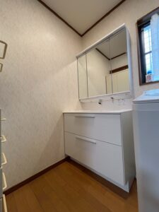 ご要望による3面鏡・引き出しタイプの洗面台が良いとの事で、LIXILのクレヴィを選定させていただきました。