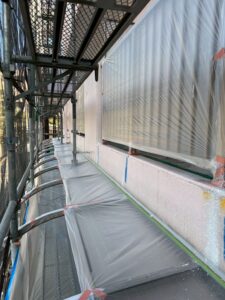 まだ工事は始まったばかりなのですが、足場工事と防水屋さんの工事が終わった段階になります。